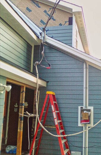 Fixing incorrect service line connections, including broken brackets, exposed conductors, or improper fascia board mounting.