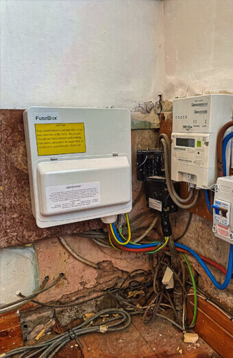 Replacement or upgrade of non-compliant metre panels, fixing exposed wiring, damaged enclosures, and missing circuit protection.